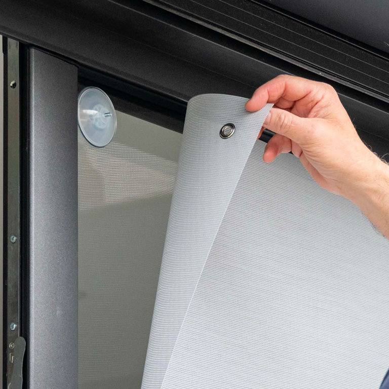 Pas d'outil. Pas de vis. Pas de trou. Positionnez les ventouses sur le vitrage, tendez la toile et profitez immédiatement de la protection solaire. L'épaisseur du dispositif est de seulement 22 mm (14 mm pour les fenêtres coulissantes).